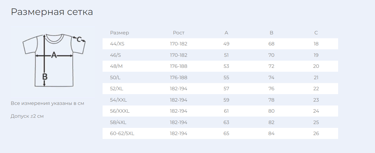 Футболка-унисекс представлена в размерном ряду от 44 до 62 размеров и в 10 цветах